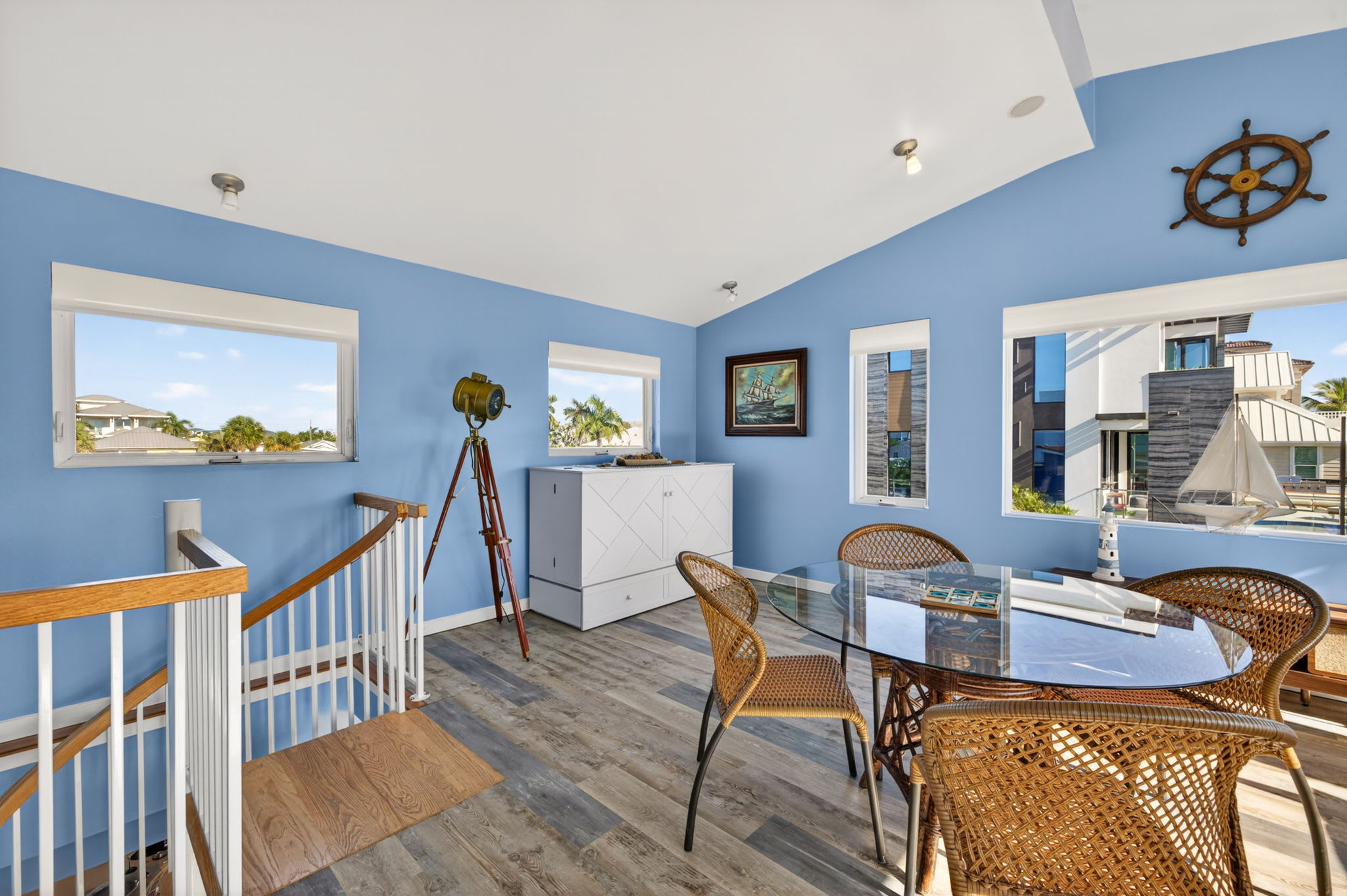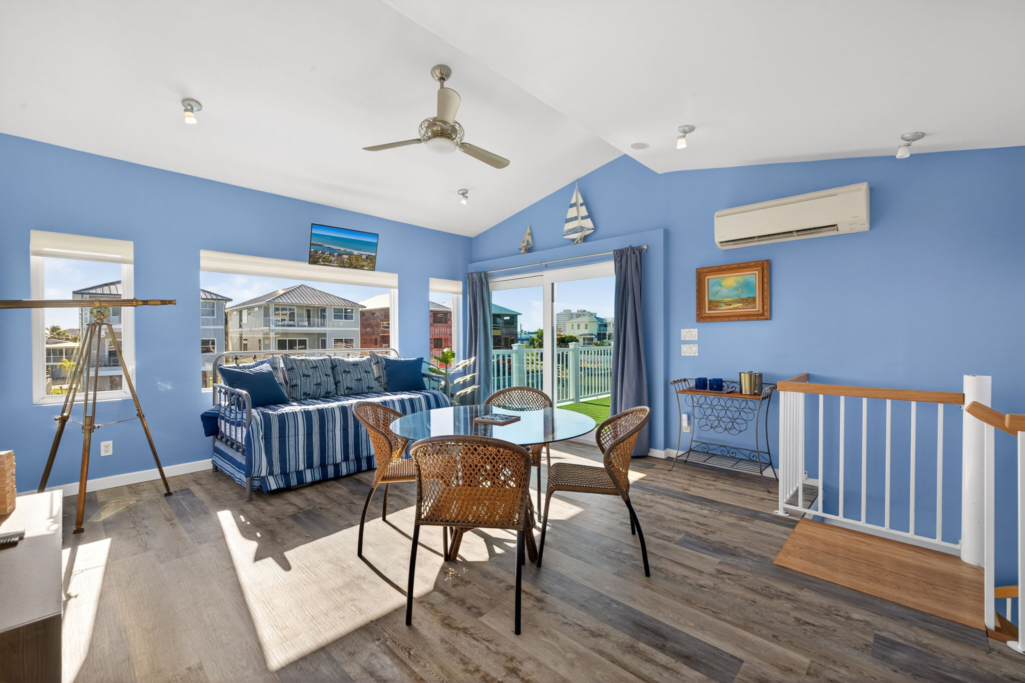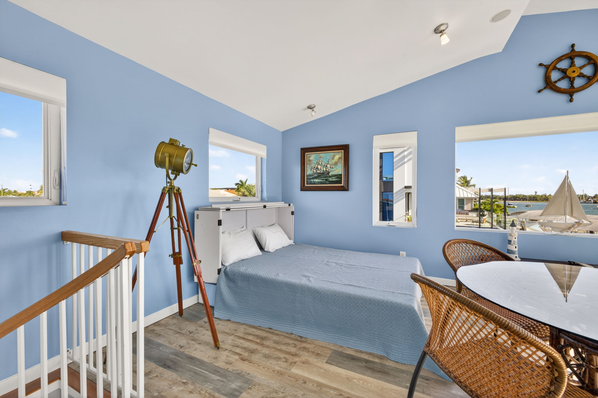 The upper loft area, when not being used as a sleeping space, doubles as one of the best viewpoints on the island—offering stunning panoramic vistas of the canal and back bay. Guests can even take a closer look at the scenery through the telescope provided, creating a unique and memorable experience day or night.