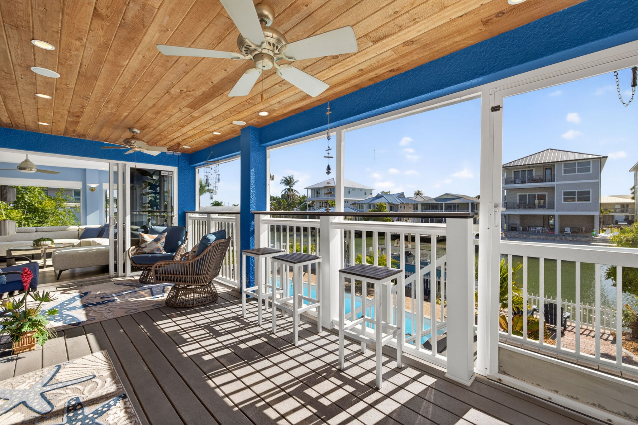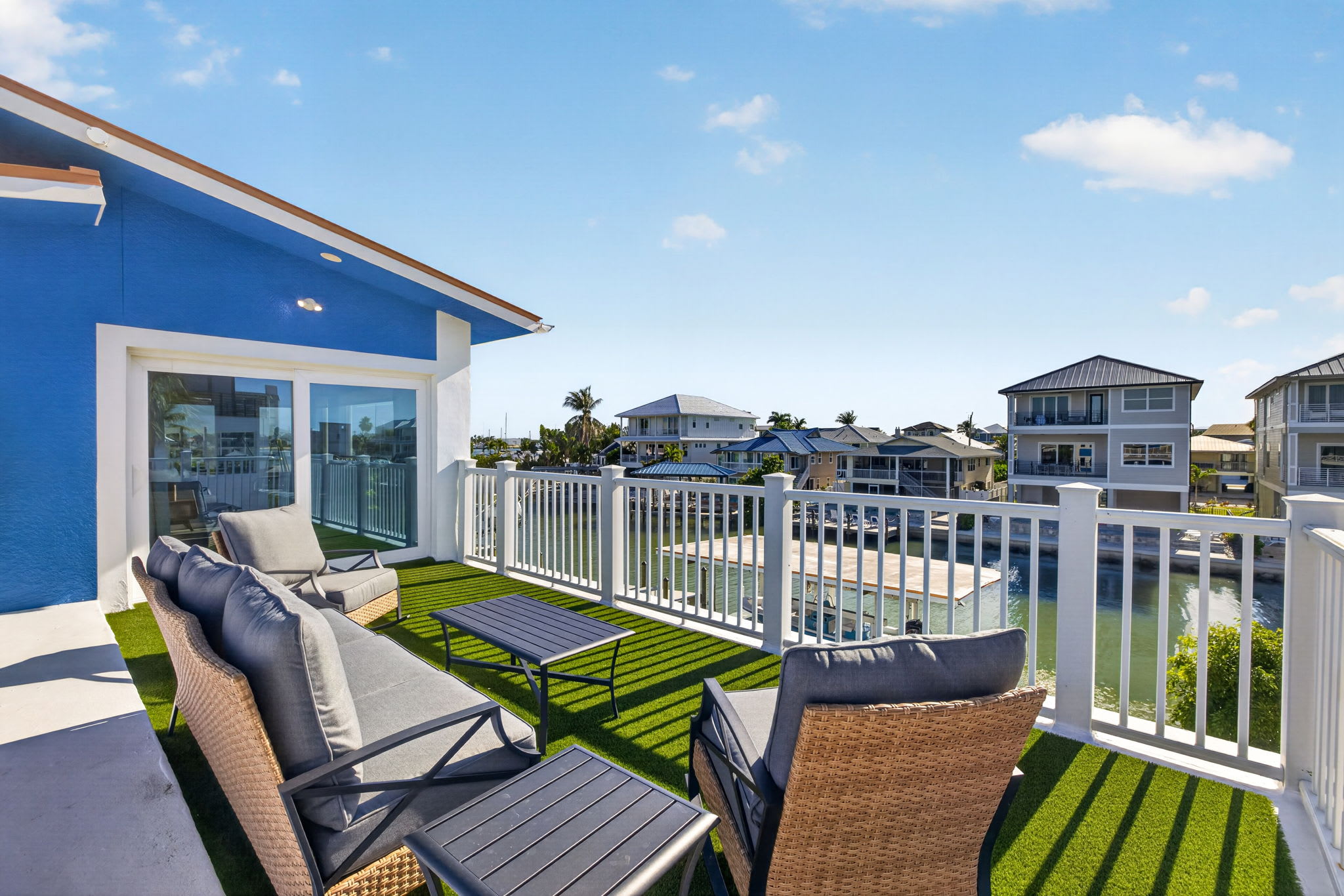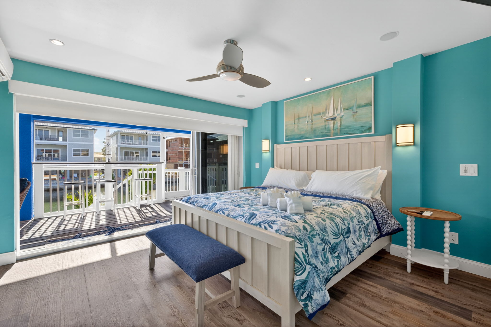 Upstairs off the lofted room, the balcony offers elevated views of the canal and back bay—perfect for morning coffee or sunset drinks.