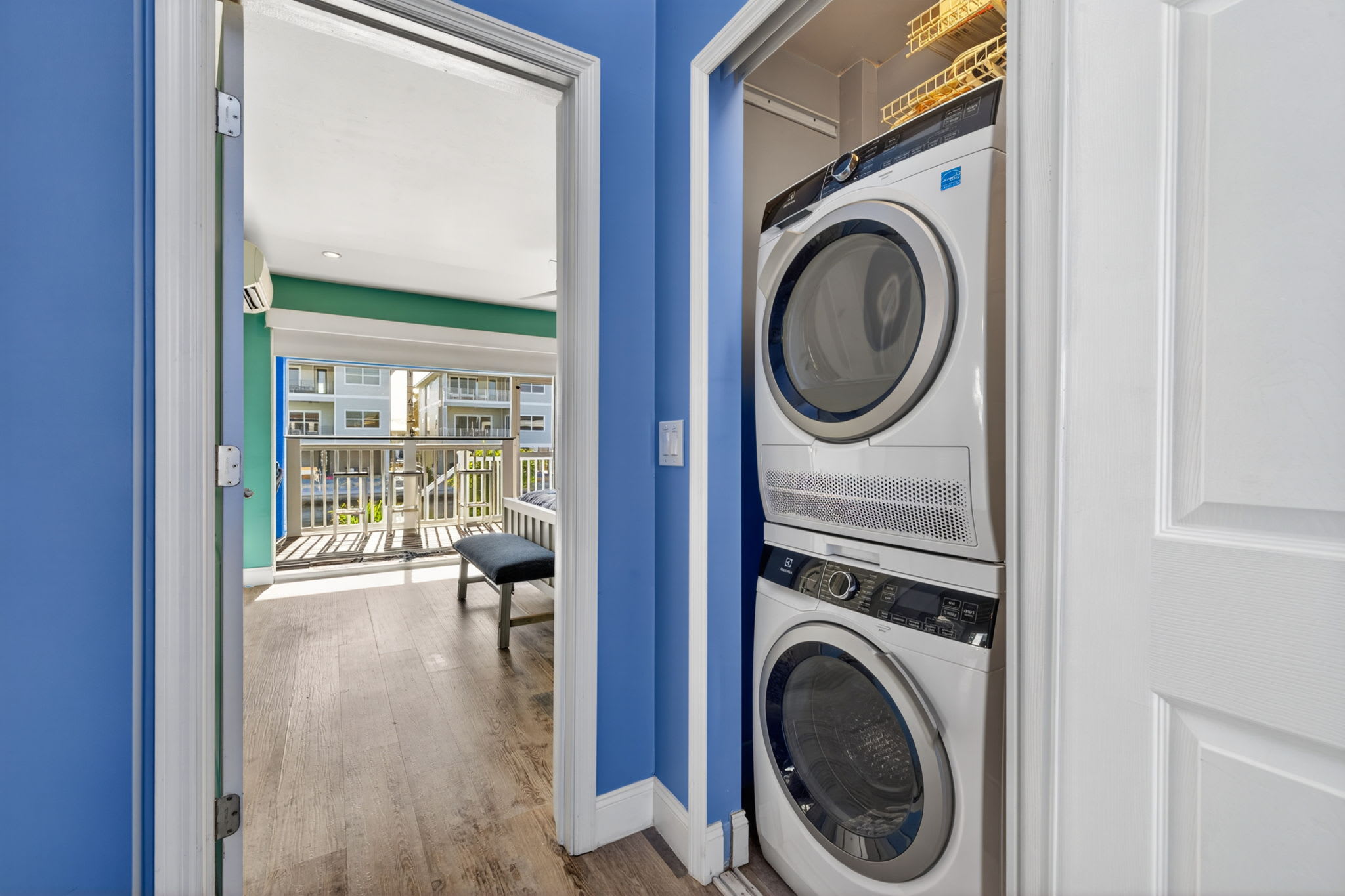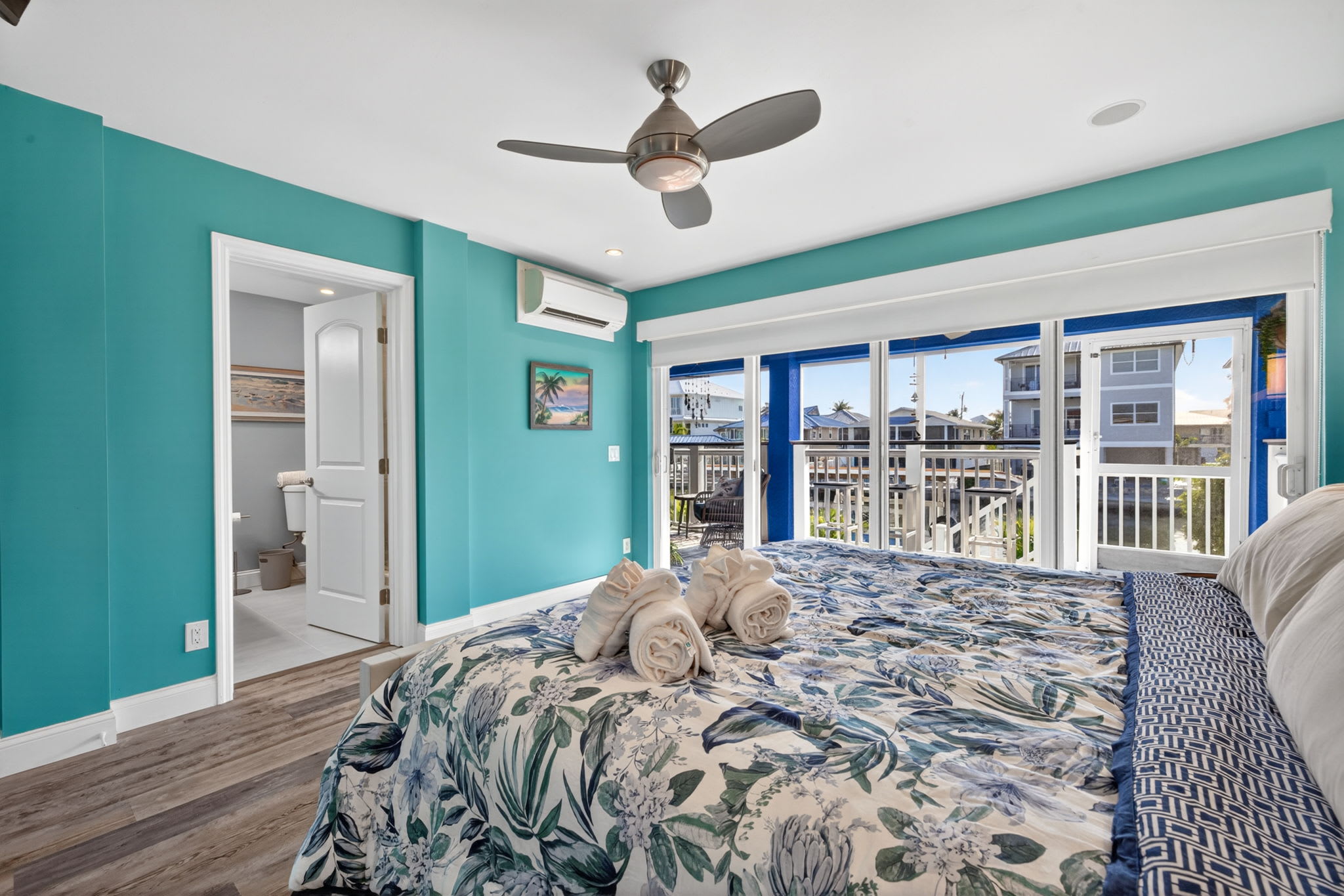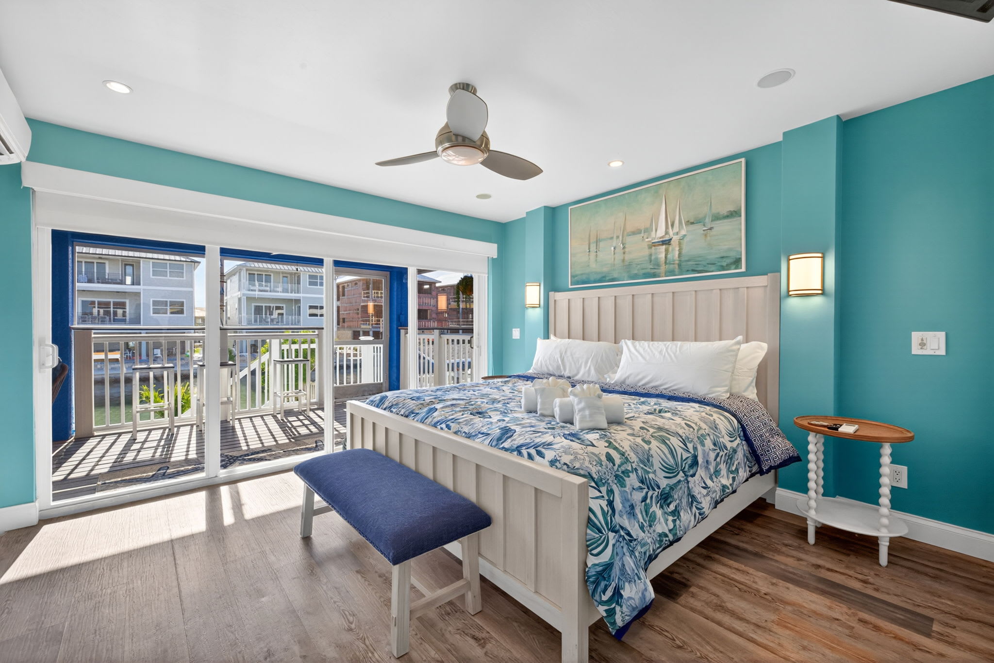 Upstairs off the lofted room, the balcony offers elevated views of the canal and back bay—perfect for morning coffee or sunset drinks.