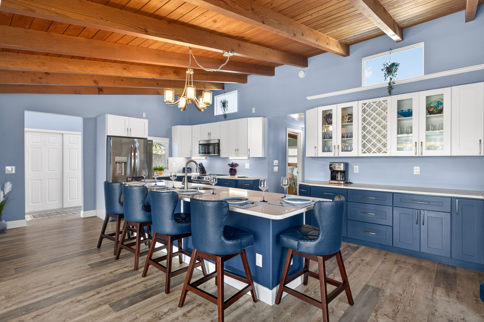 The bright, updated kitchen features modern appliances, ample counter space, and a large island with seating—perfect for casual meals or gathering with family and friends.