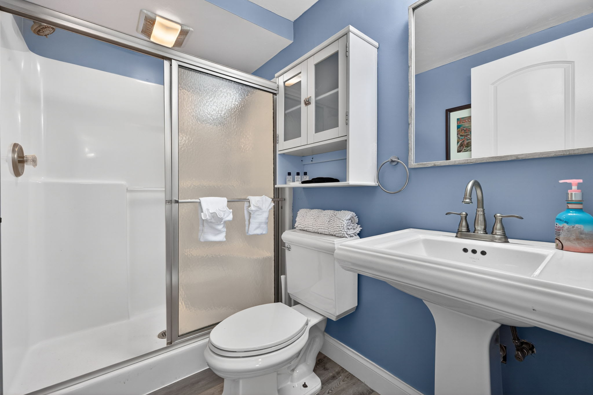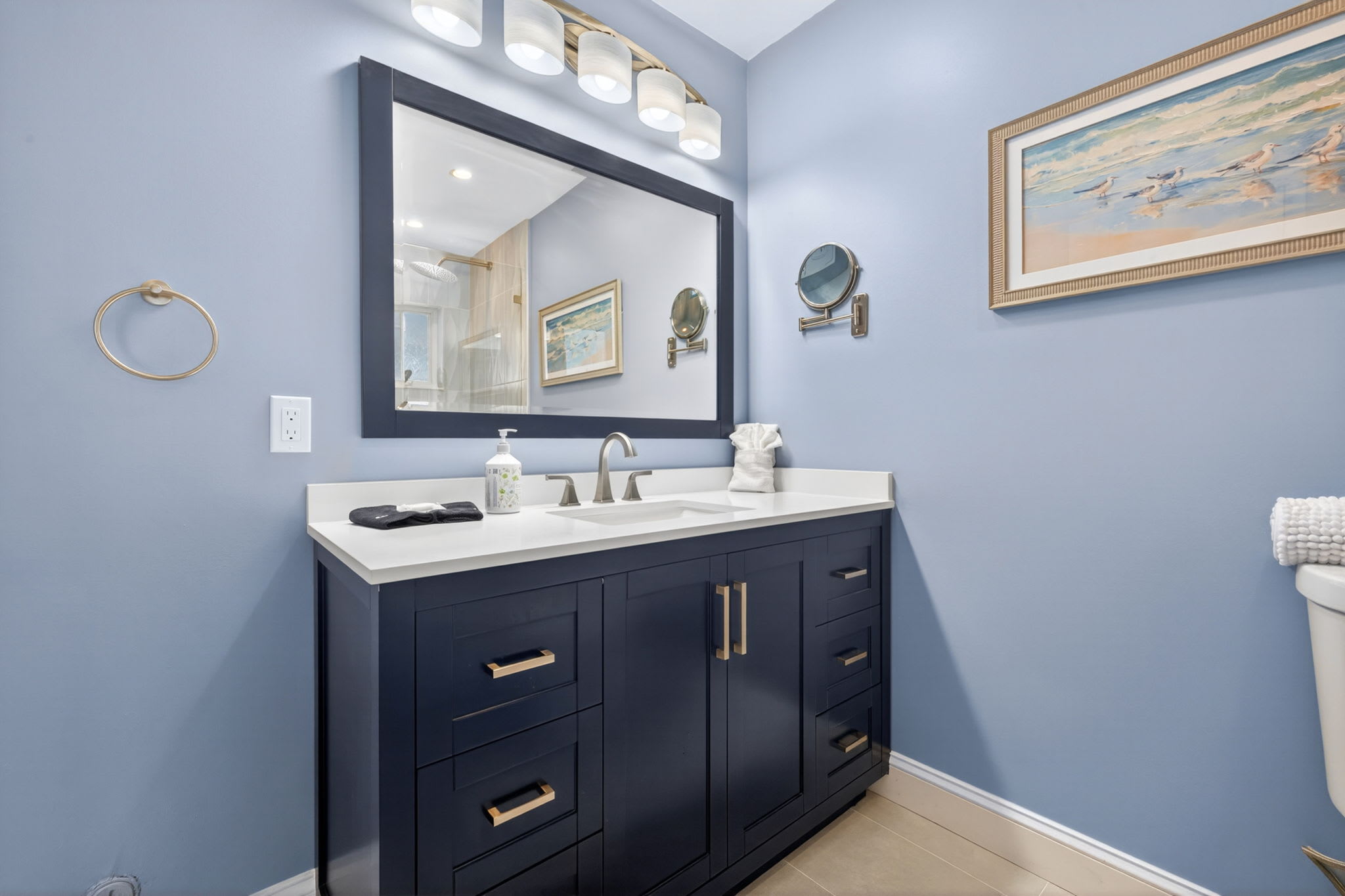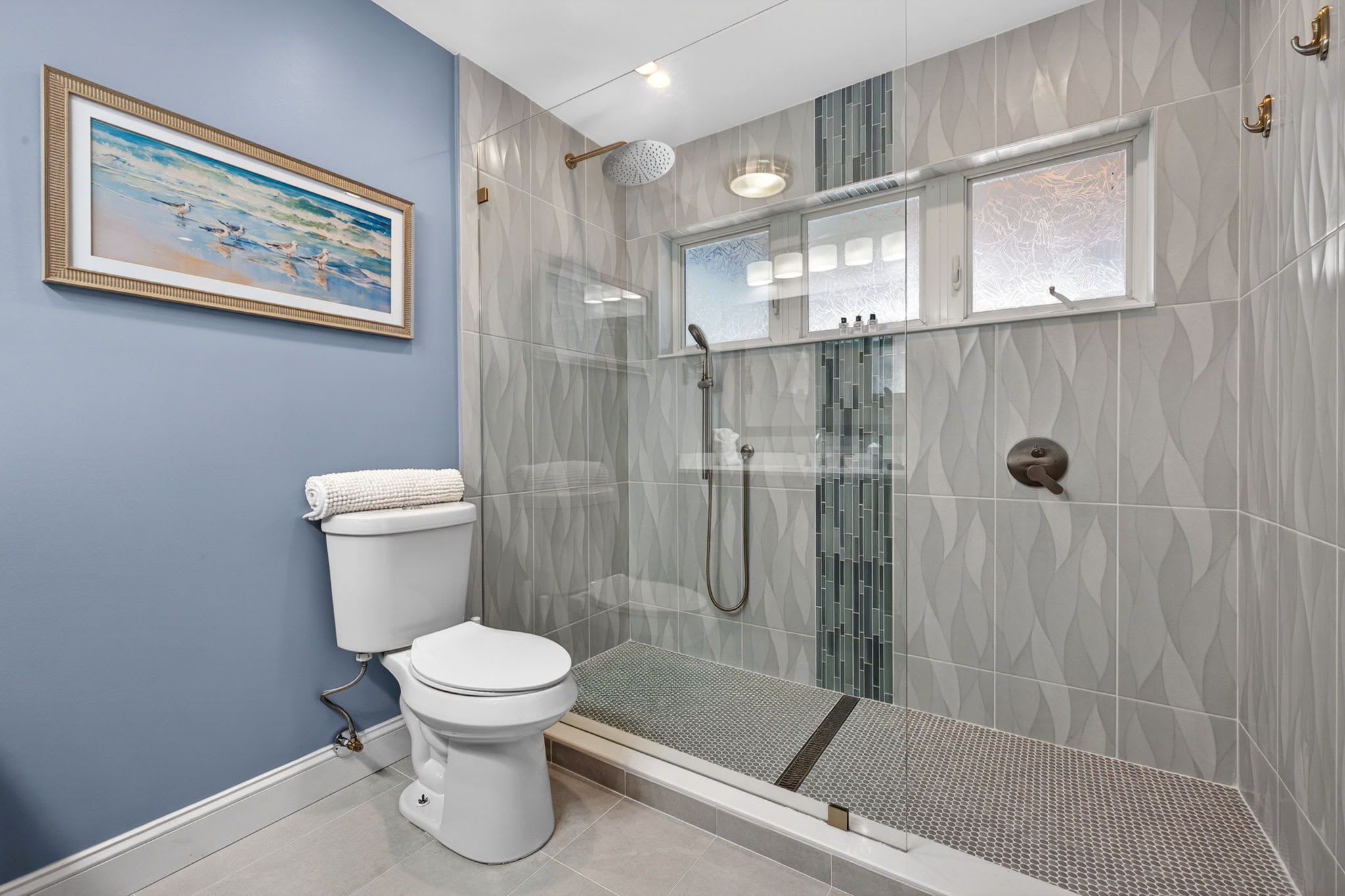 The home includes three full bathrooms, including a newly remodeled ensuite in the primary suite. Each bathroom is fully stocked with shampoo, conditioner, body wash, fresh towels, and essential toiletries—so guests can relax from the moment they arrive.