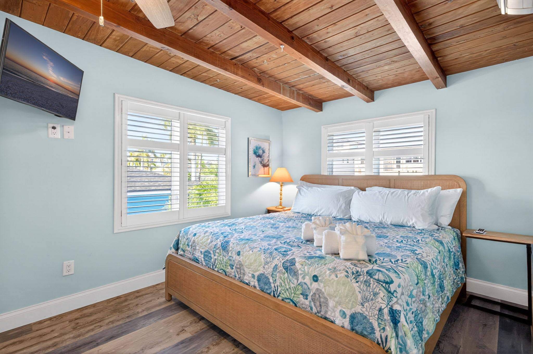 A serene retreat with a king bed, dedicated workspace, and a beautifully remodeled ensuite bathroom. Large sliding doors open directly to the screened porch, offering peaceful views of the pool and canal.