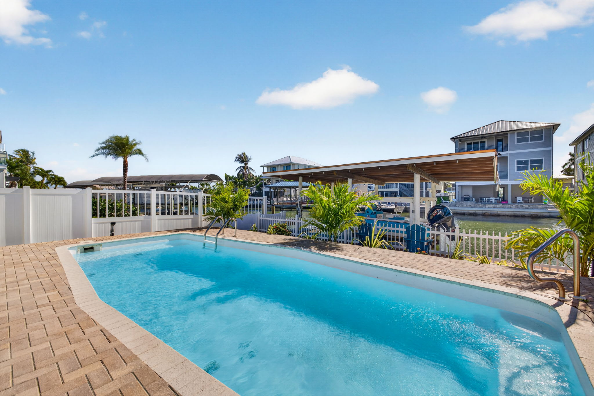 The canal-front backyard features a heated pool surrounded by lounge chairs and multiple seating areas designed for both sun and shade. Enjoy: