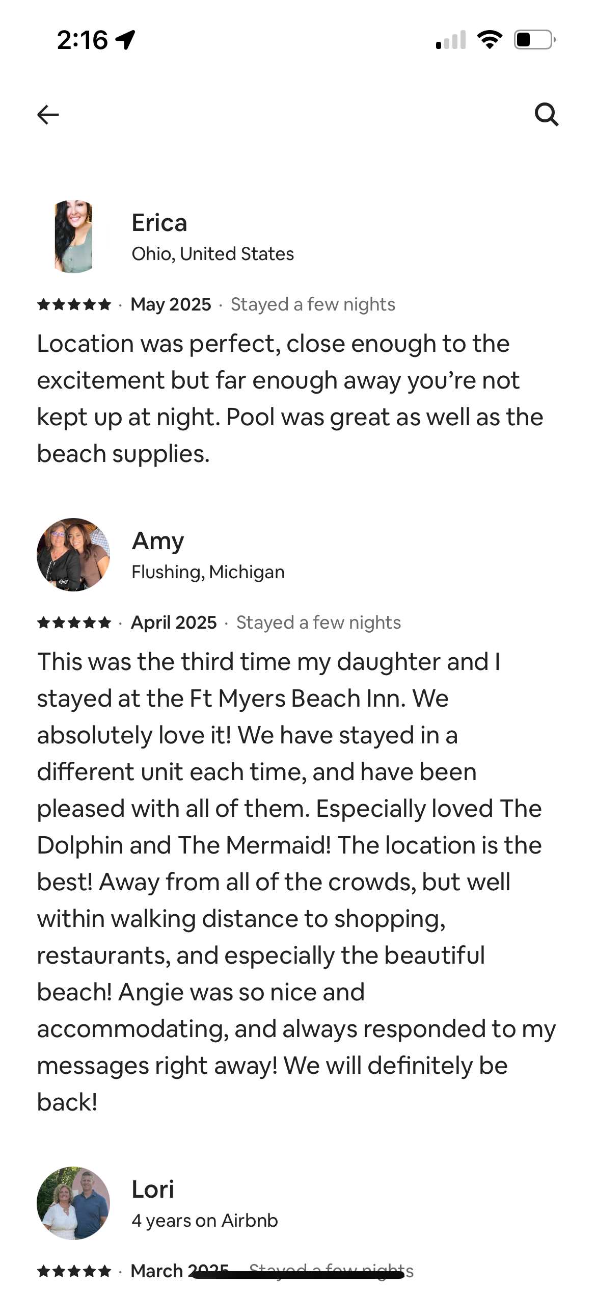 It’s “beachy” and location was great and unit was clean, but a lot to be desired. We felt like it was overpriced for what it was. It’s a good thing it only ended up being 2 of us instead of 3 because it’s definitely only fit for a maximum of 2 adults. No insulation in this building, so it was very difficult to get sleep or relax. Can hear the people staying above us walking around. The bathroom is tiny. Zero room for much to hang, funky wall unit AC that shuts off (need to have on to circulate air). It’s not ideal. Would have been more comfortable to stay at a hotel inland for less and just drive to the beach. Angie was friendly and tried to be proactive by having someone come during our stay to put up hooks and bring more hangers.- Anonymous , Posted: 1/28/2026Jamie, I am so sorry that you were not completely satisfied with your stay. We have never had anything other than a five star review at this brand newly remodeled location. This historic Fort Myers Beach Inn is not modeled after a Hilton or Four seasons. It is a casual beachy vibe location. That Apartment is actually one of my favorites at that location as it walks out to the picnic area through the front doors and is adjacent to the standard Fort Myers Beach Island size pool. Apartment is not large, but we’ve had plenty of times that six people have stayed and have loved it. I guess everyone has their personal preference. As for the cost, definitely being a block away from the Gulf is significantly more money than being inland in a hotel. Maybe you’ll give us another chance at another location. Obviously we would love to host you again. All the best to you.- Beach Villas staff, Posted: 1/31/2026