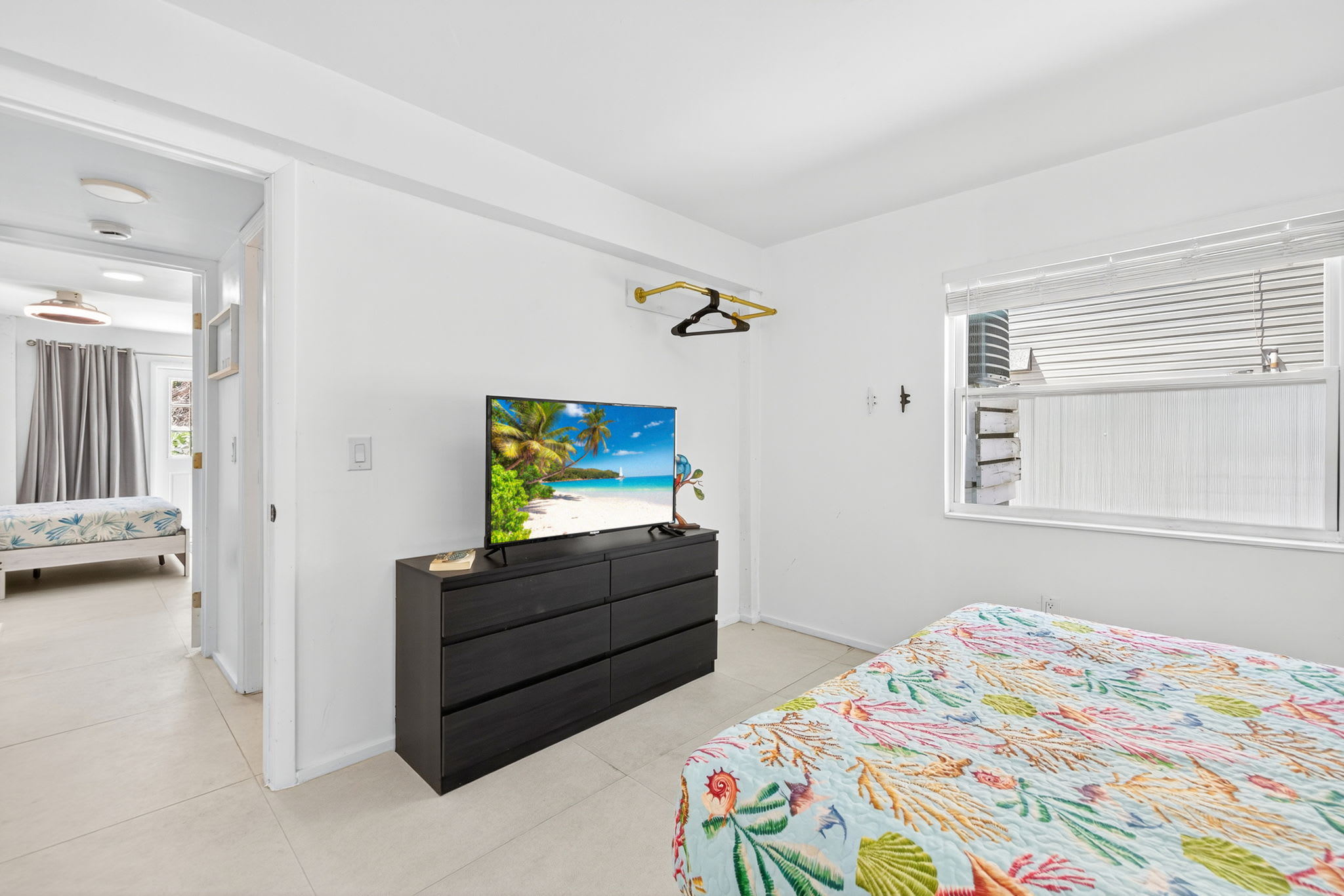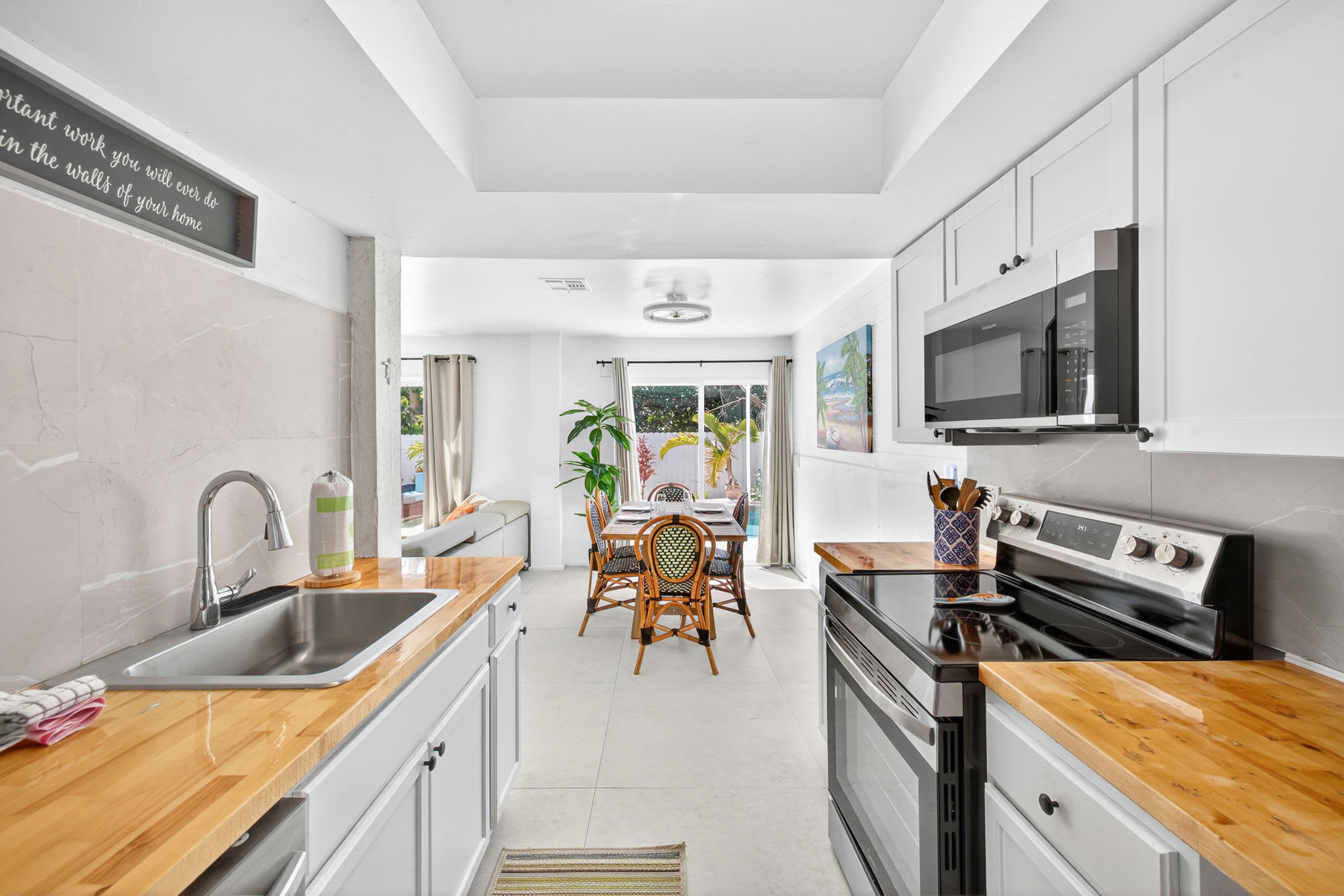 The fully equipped kitchen, located adjacent to the living area, includes a refrigerator, stove, dishwasher, and microwave, providing everything you need for cooking and entertaining. The bedrooms are located along a quiet hallway just past the kitchen. The primary bedroom features a comfortable queen bed and en-suite access to the primary bathroom, complete with a single vanity, walk-in shower, and a convenient door leading directly to the pool area. The second bedroom also offers a queen bed, while the third bedroom includes both a queen bed and a bunk bed—perfect for additional guests or families. Both the second and third bedrooms share access to a full bathroom with a single vanity and walk-in shower.