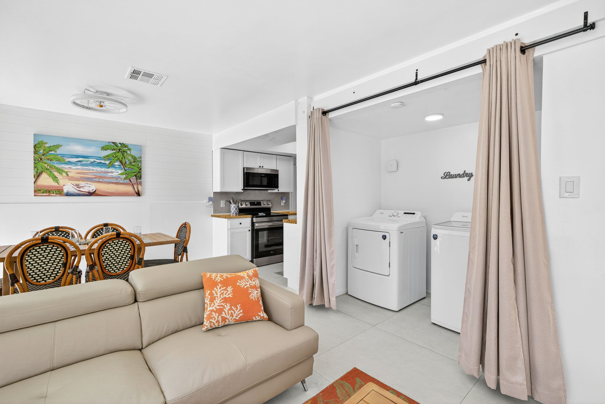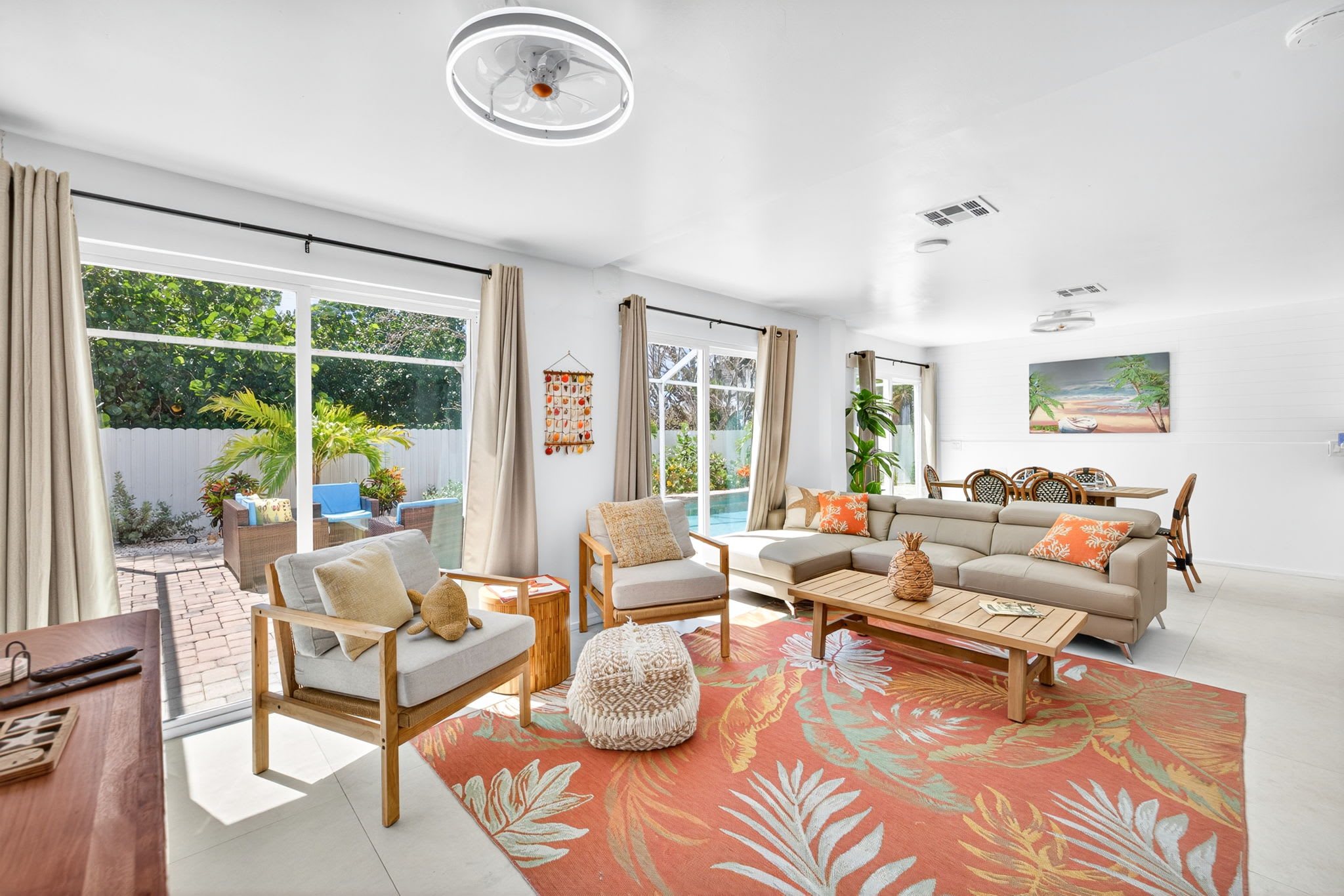 The open-concept living area is bright and inviting, featuring a spacious dining table with seating for six, a large sectional sofa, and a brand-new 75-inch Smart TV—ideal for relaxing evenings after a day in the sun. Multiple sliding glass doors open directly from the living area to the beautiful pool and patio.