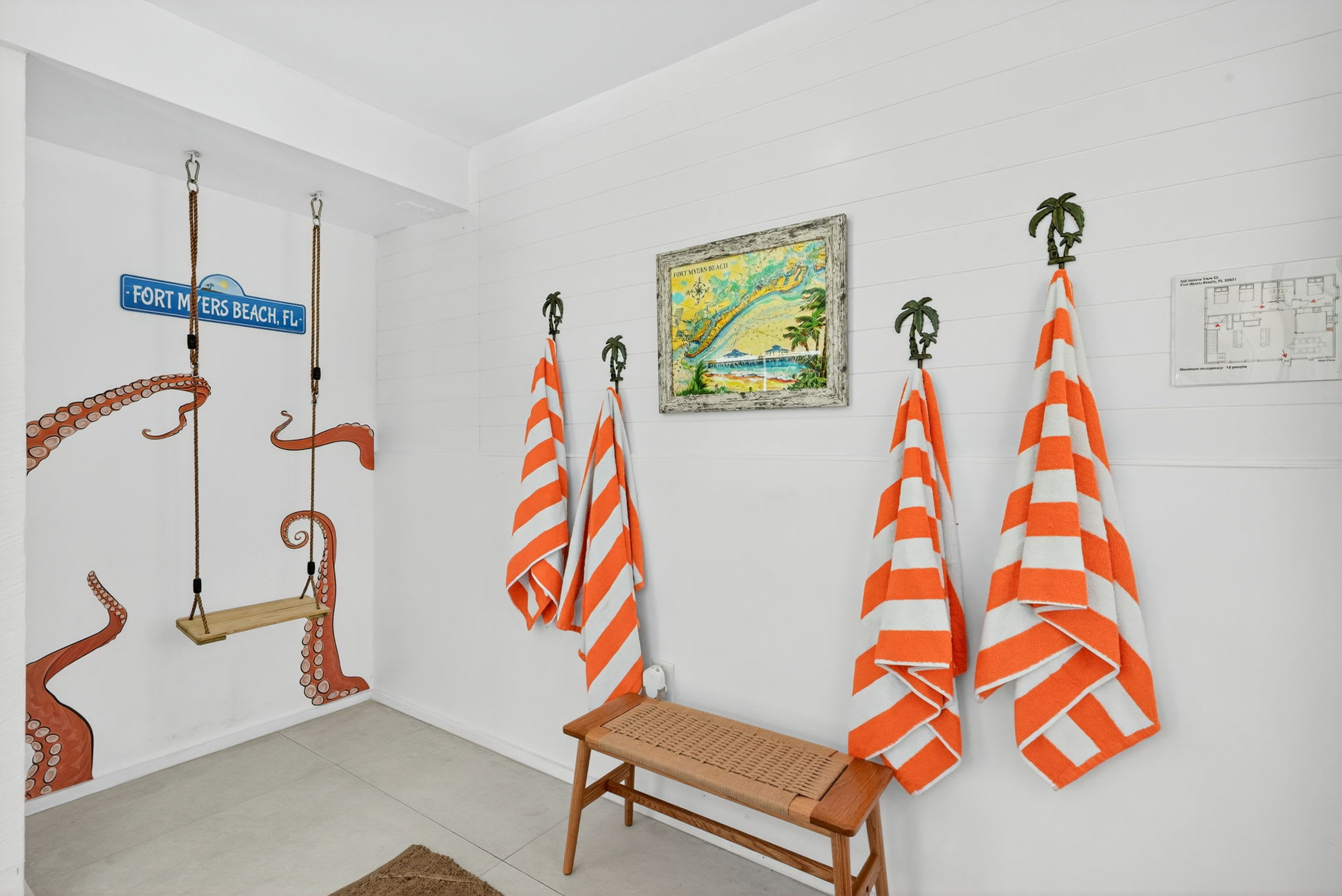 The outdoor space is well-furnished with plenty of seating, surrounded by lush landscaping with small palms and enclosed by a white privacy fence. The property backs up to Matanzas Preserve, offering peaceful views and total privacy from neighbors and street noise. As an added convenience, there’s also an outdoor shower located just off the entrance to the ground-level residence—perfect for rinsing off after a beach day or swim. The private pool spectacular and is maintained at a comfortable 83°F even during Florida’s cooler months, it’s the perfect spot to soak up the sun. Don’t forget your sunscreen—you may not want to leave! On a cooler Florida evening the fire pit just the right choice!