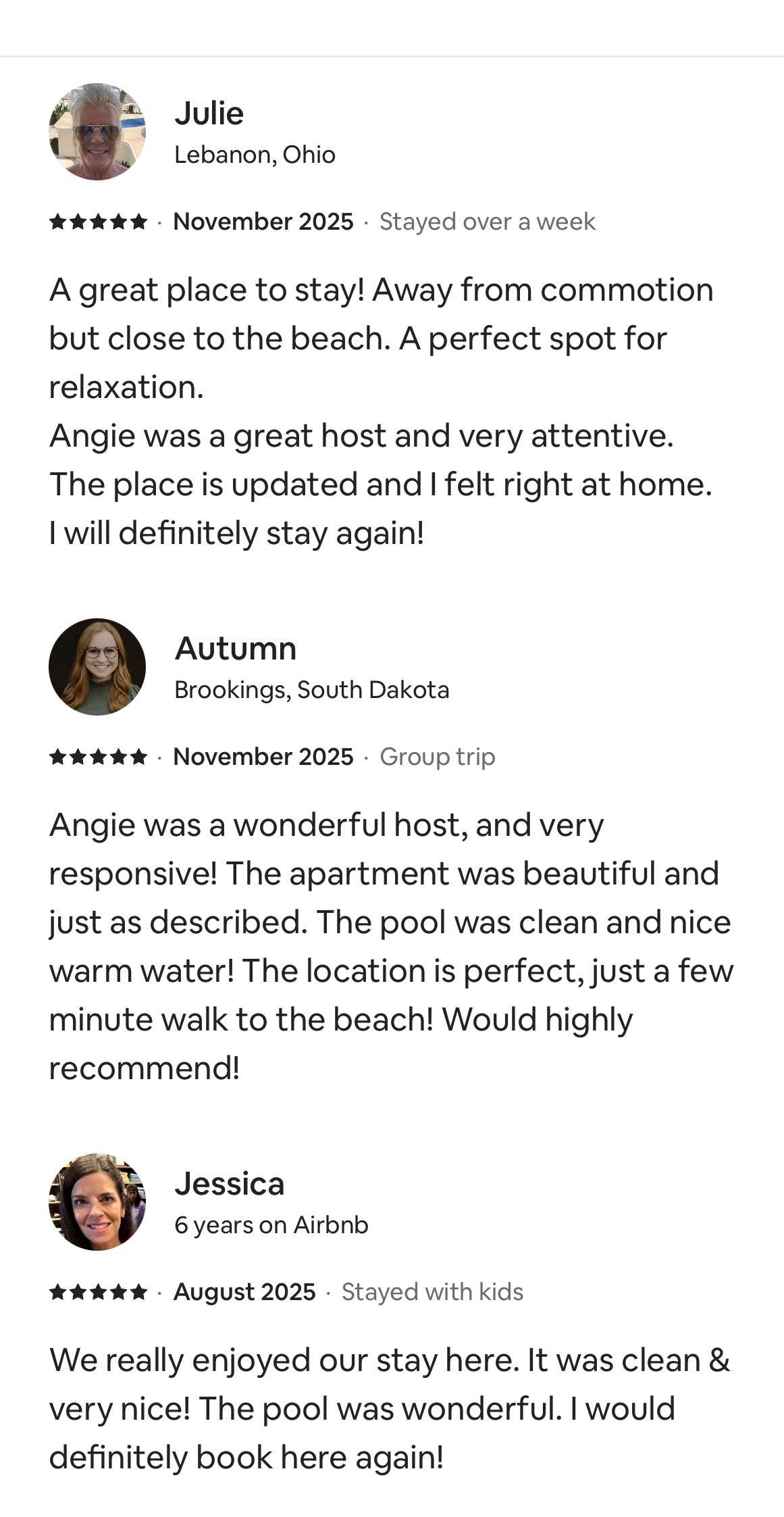 We had an amazing stay!! So thankful for the beach chairs, cooler and wagon the host had to offer. The accommodations were so clean and comfortable, pool was great and just a short walk to the beach. Definitely recommend staying here!!