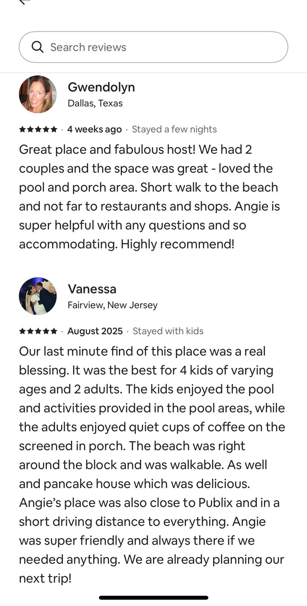 Angie’s place was exactly as described in the listing and just a block or two from the beach. She provided beach chairs, towels, a surfboard, and an umbrella, which made our beach time even better. The pool is shared, as Angie mentioned, but it wasn’t an issue at all and we really enjoyed using it. The front deck is also shared and has screens, so we could sit there comfortably without worrying about bugs. The kitchen lacks basic items like salt and pepper. There is a Publix, less than five minutes away so any missed groceries can be bought easily there.\nOverall, our group had a great stay.