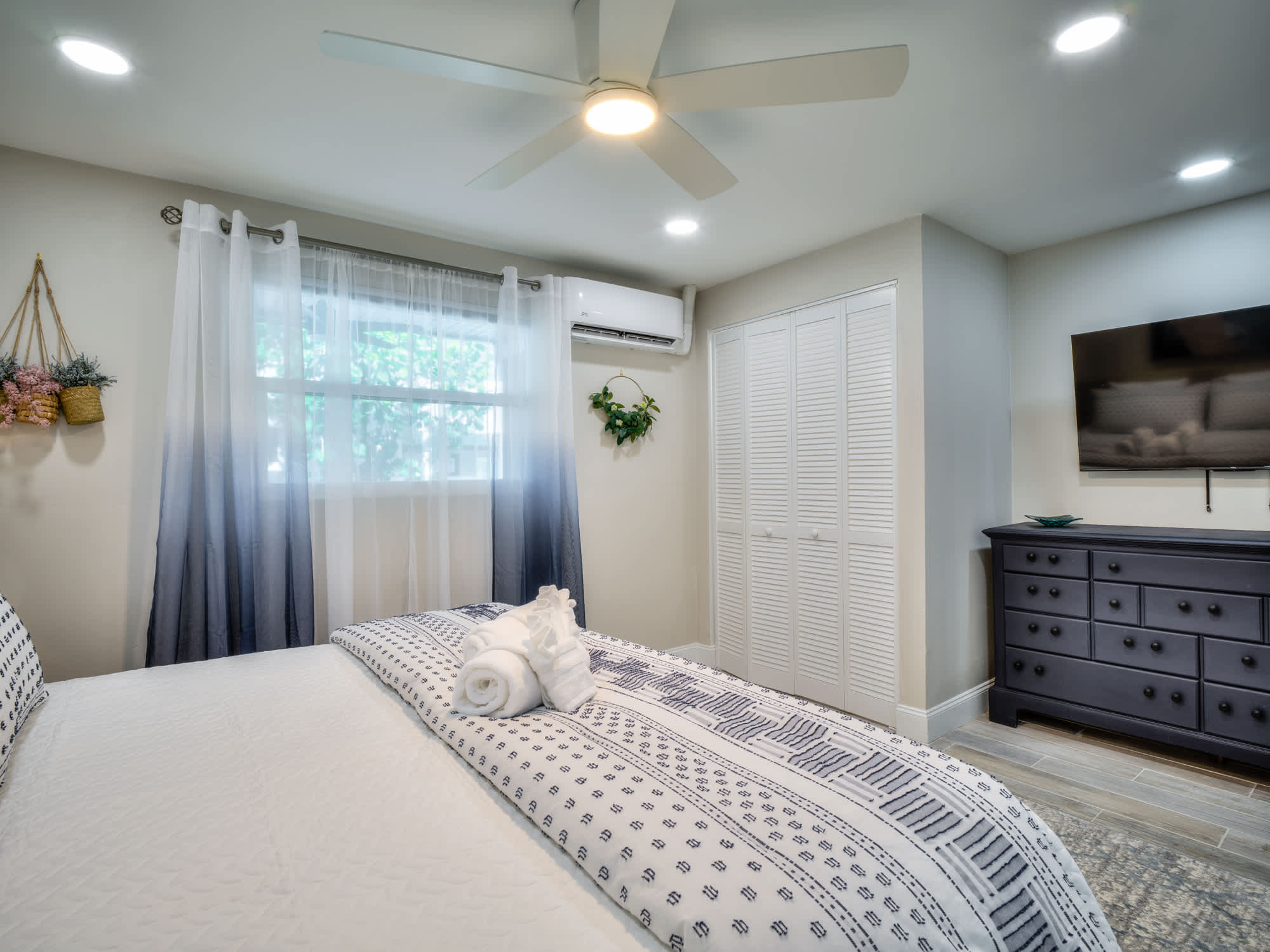 We were so impressed with this accommodation and the host. The unit has been barely used so is in great condition and as good as new. The pool was very well heated and a nice mix of outdoor furniture. The bedroom bed was very comfortable. One mini split A/C in the living room and one in the bedroom made the indoor temp very comfortable. We walked to Sun N Fun and rented bikes for $30/week each to get around the full island to avoid the 3-6pm northbound rush hour. It turns a half hour car ride into a 5 minute bike ride to Lah de Dah, which was excellent, and so was Coste restaurant. All appliances including laundry machines were excellent and brand new. The beach equipment was perfect and plenty available for the unit. Our host was very responsive and accommodating every time we reached out with questions. Thank you and we hope to be back again!