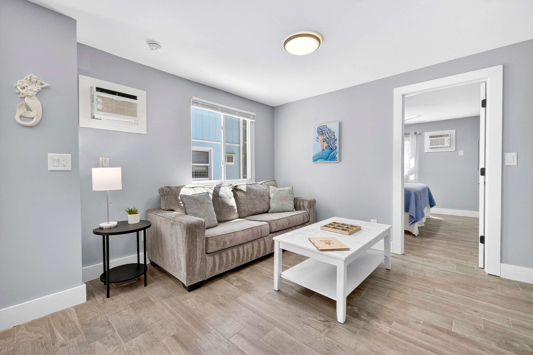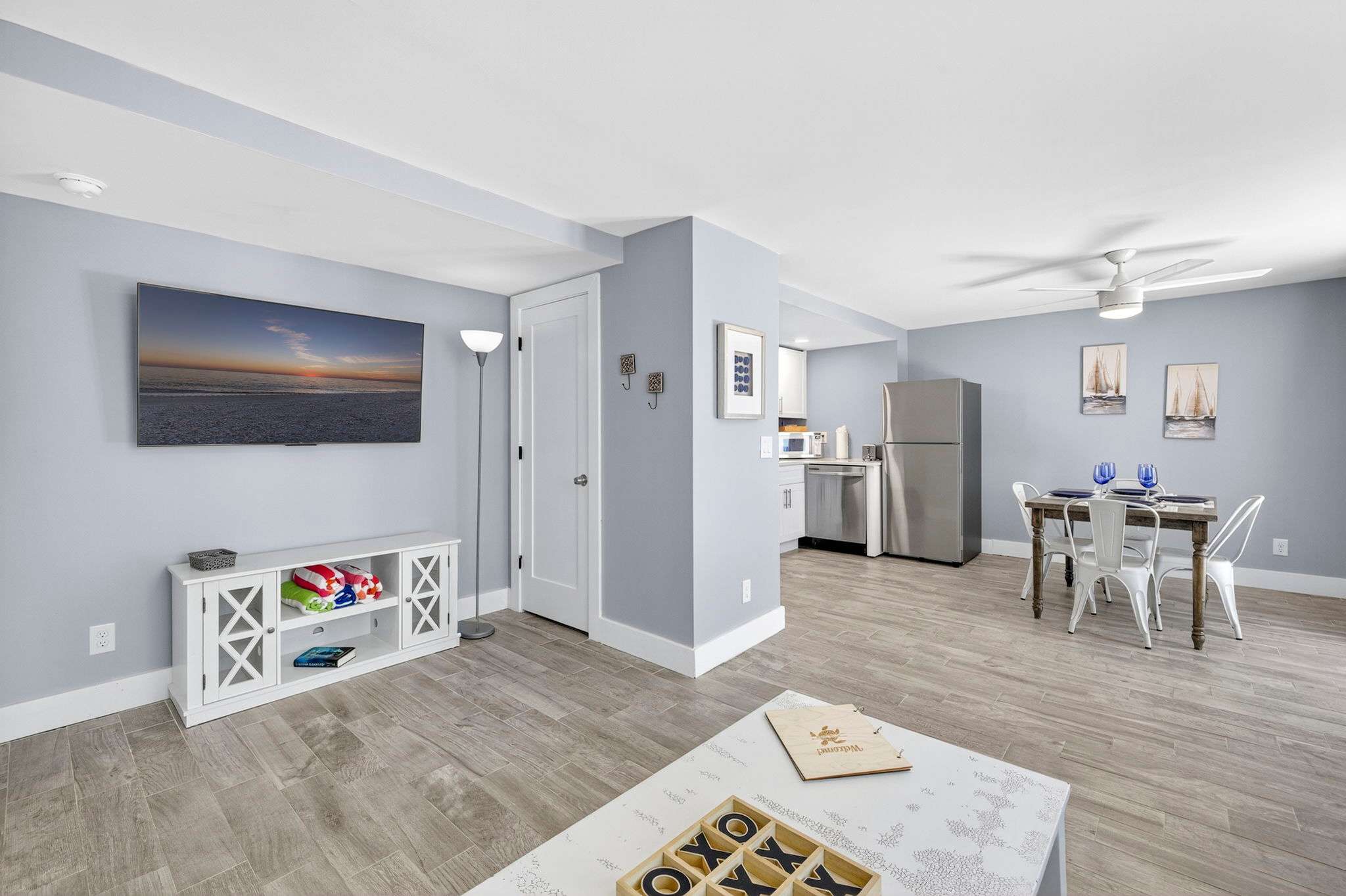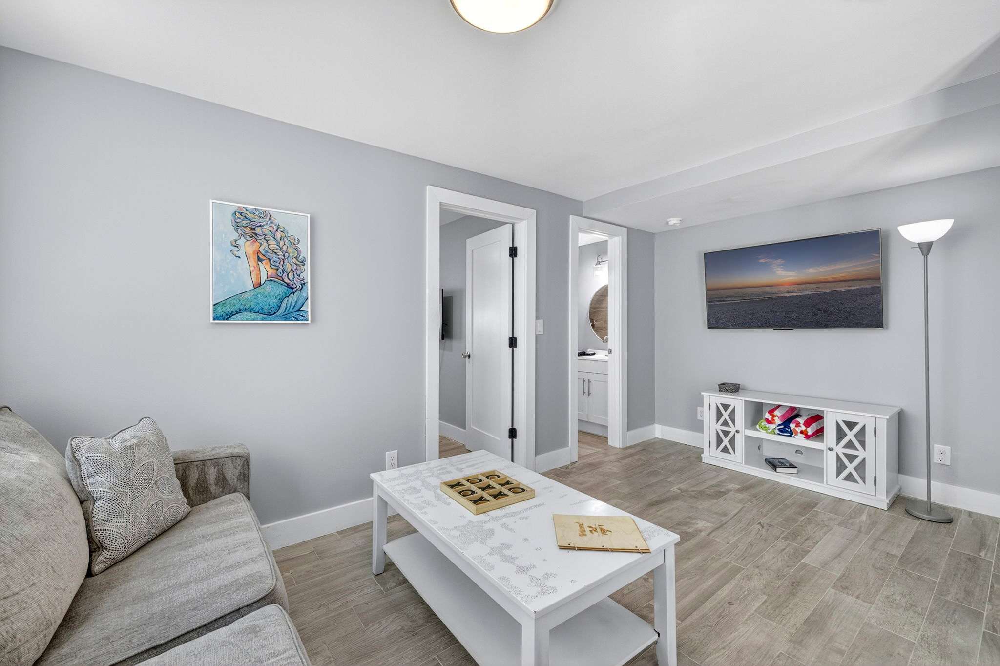The modern, well-equipped kitchen includes all the conveniences you need while in your home away from home. Plenty of pots, dish-ware and utensils to create a feast or simple beach bites. The kitchen table seats 4 comfortably. The living room sofa converts to a queen sleeper. There is an extra closet in the living room as well as a large Smart TV—ideal for curling up for a movie night after a day in the sun.