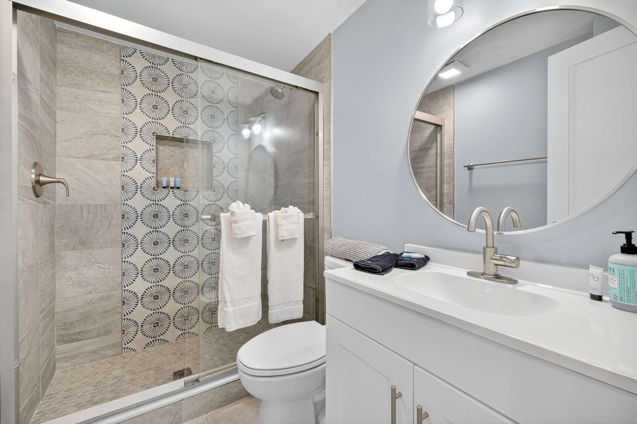 The bathroom for this apartment was just remodeled. Beautifully updated with the latest tile and walk-in shower. The new vanity has plenty for space for your personal items and we make sure you have a hair dryer there for your use.