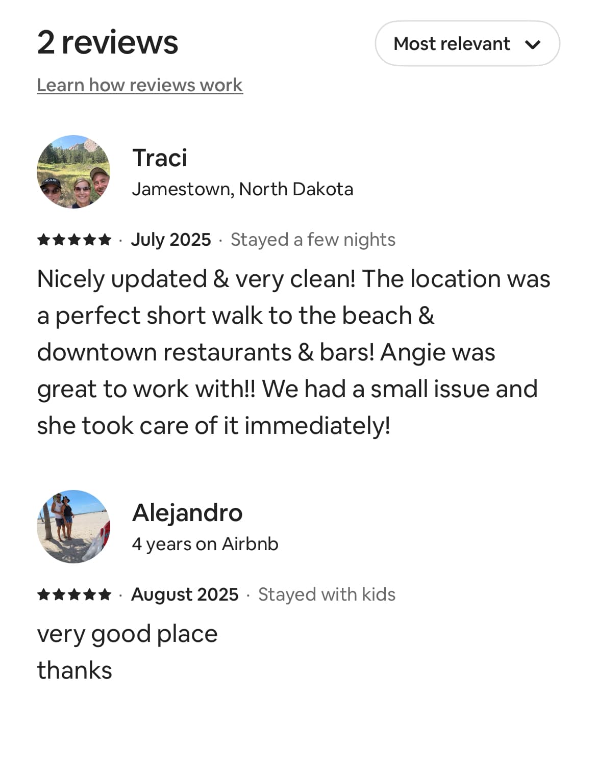 We had such a great stay! The apartment was super spacious and had everything we needed. The location couldn’t have been better—just a quick 3-minute walk to a beautiful, peaceful beach, and really close to Publix and some great restaurants. The beach was clean and not crowded at all, and the water was perfect. It was also really nice having beach chairs and supplies available—definitely a great bonus!
