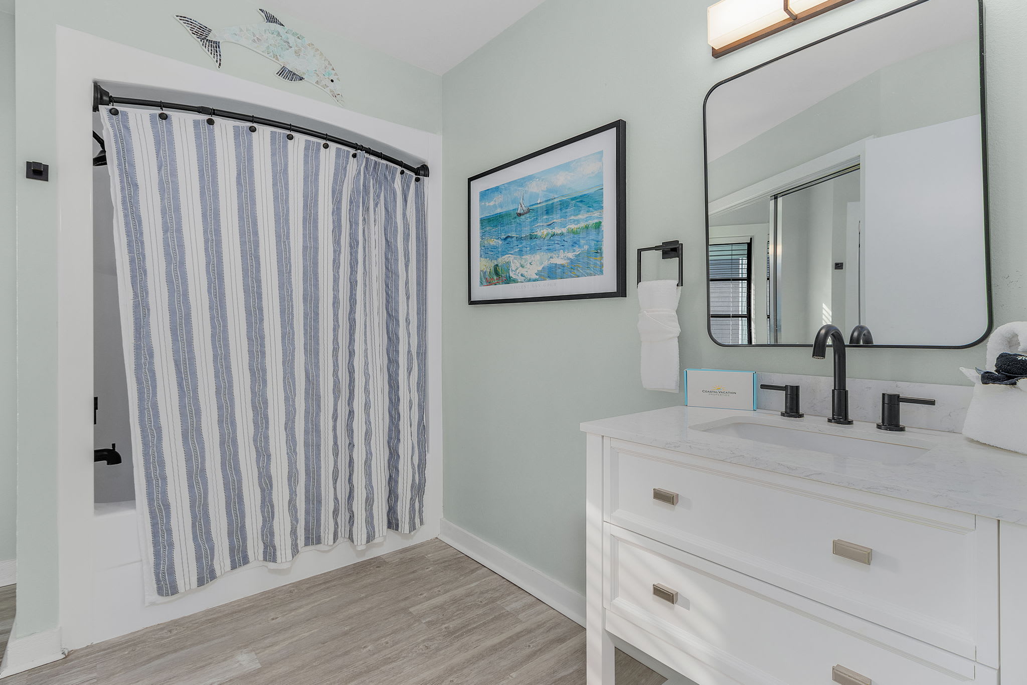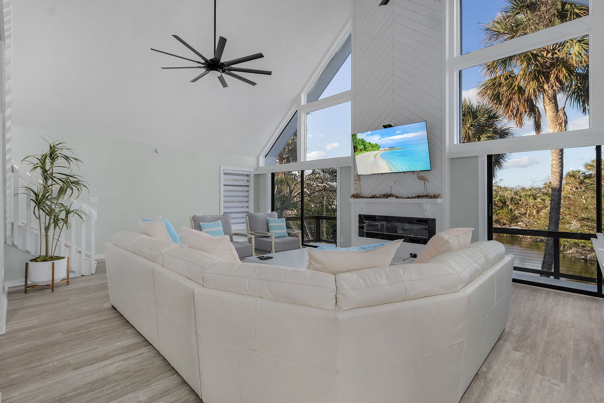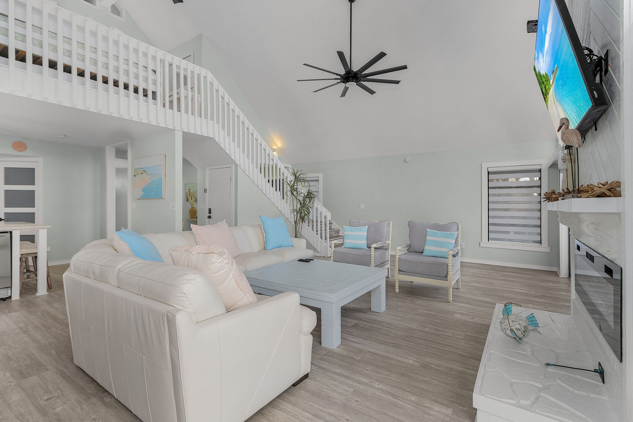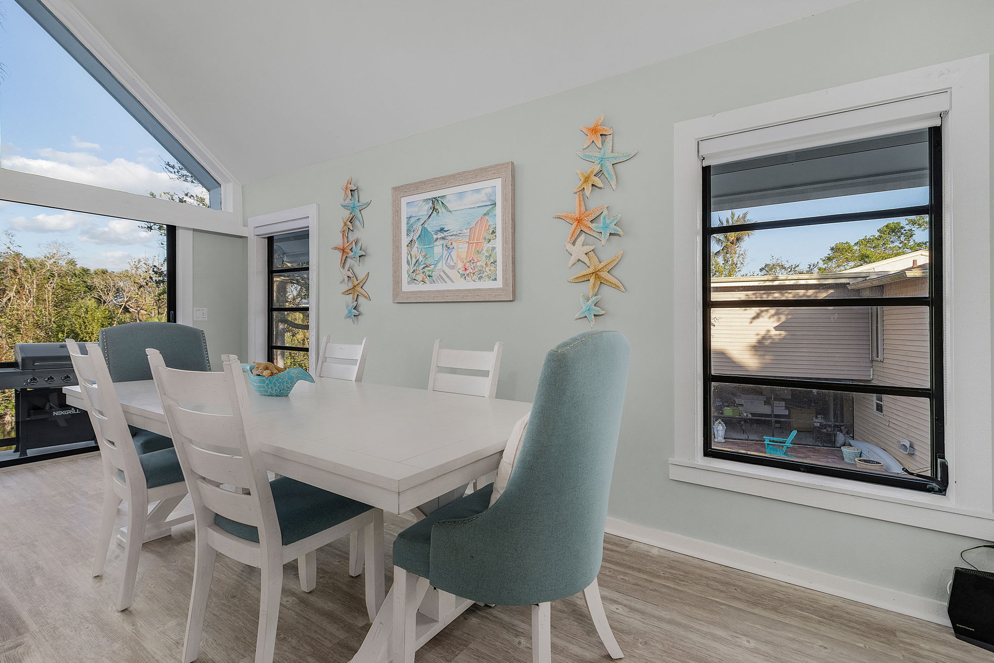 The main floor great room is a true showstopper, featuring floor-to-ceiling windows and sliding doors that showcase breathtaking views of the small lake and nature preserve. Sink into the oversized sectional sofa or one of the cozy accent chairs and enjoy a movie on the large Smart TV mounted above the modern electric fireplace. This space also has a lovely coastal style dining table and chairs that seats 6. This inviting space offers plenty of room for your whole group to relax together in comfort. Step through the sliding doors to the outdoor deck, complete with comfortable seating and a propane grill—the perfect spot to take in the unmatched views.