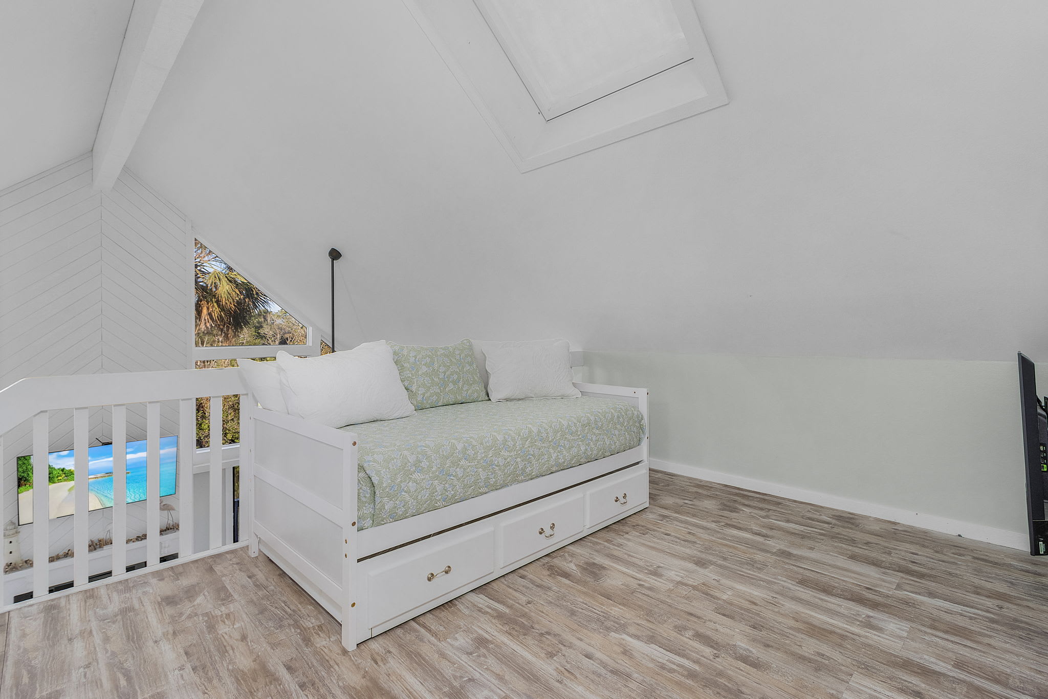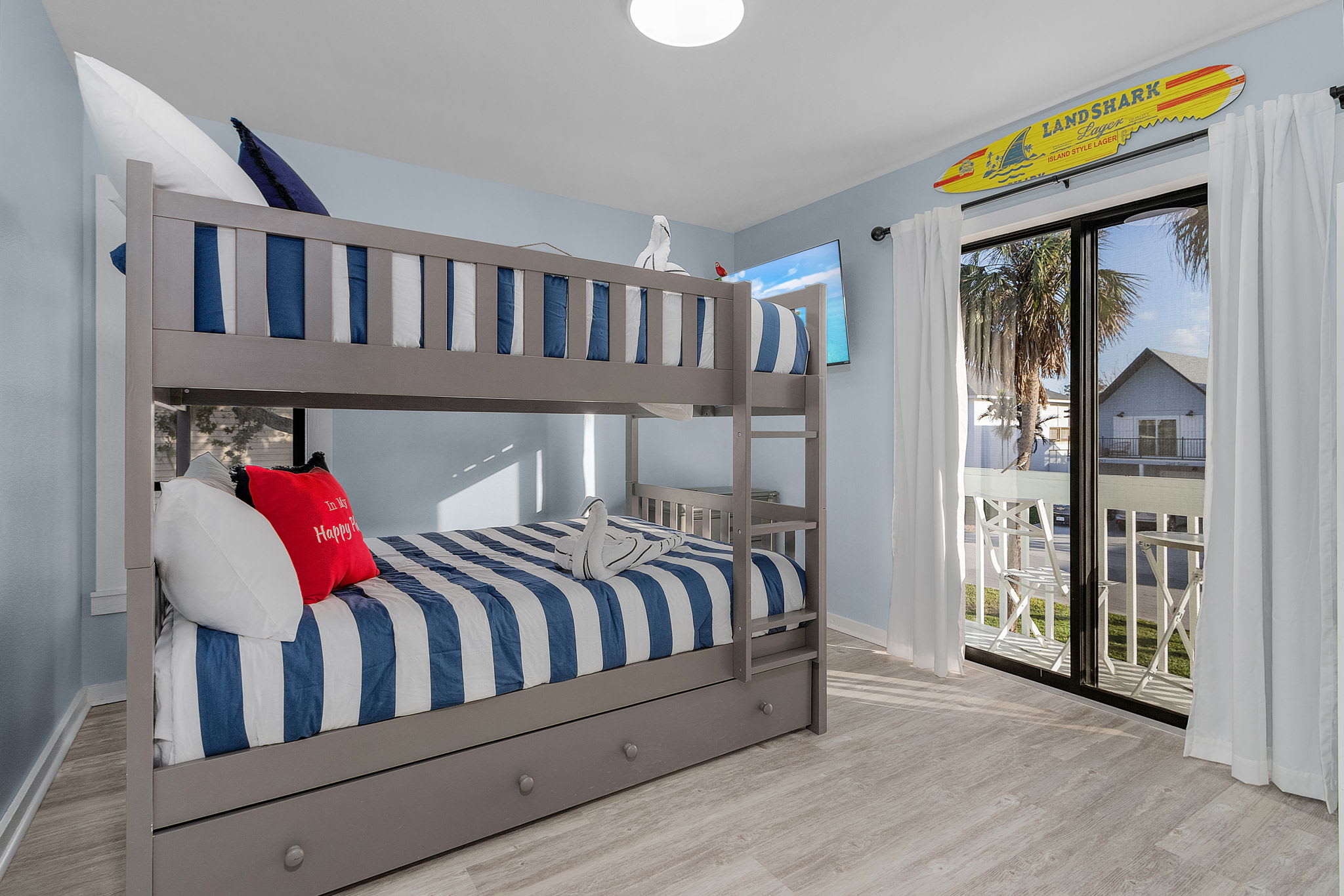 The main level and upper level of the home has three bedrooms. All three have Smart TV's. Main level bedroom 1 has a queen bed ample clothing storage including a dresser and a spacious closet. This bedroom also feature a small private balcony with delightful neighborhood views. Main level bedroom 2 has unique 2 full bunkbed plus a twin pullout style drawer. You will also enjoy a small balcony with serene neighborhood views. Upper level bedroom 3 is a huge bedroom that has 2 king beds. Vaulted ceilings adds to the character of this cool loft feeling space. Drawer and closet space galore. Just outside this room is the 2 twin sleep nook.