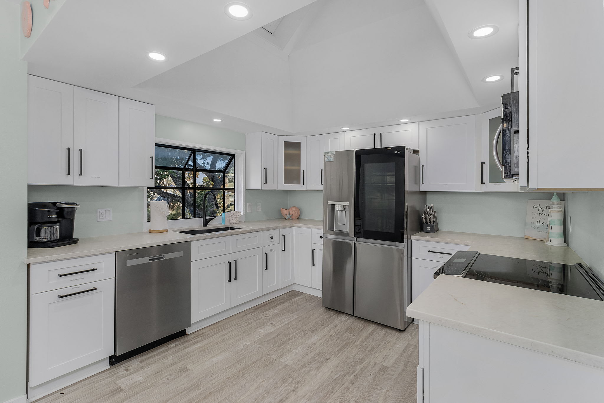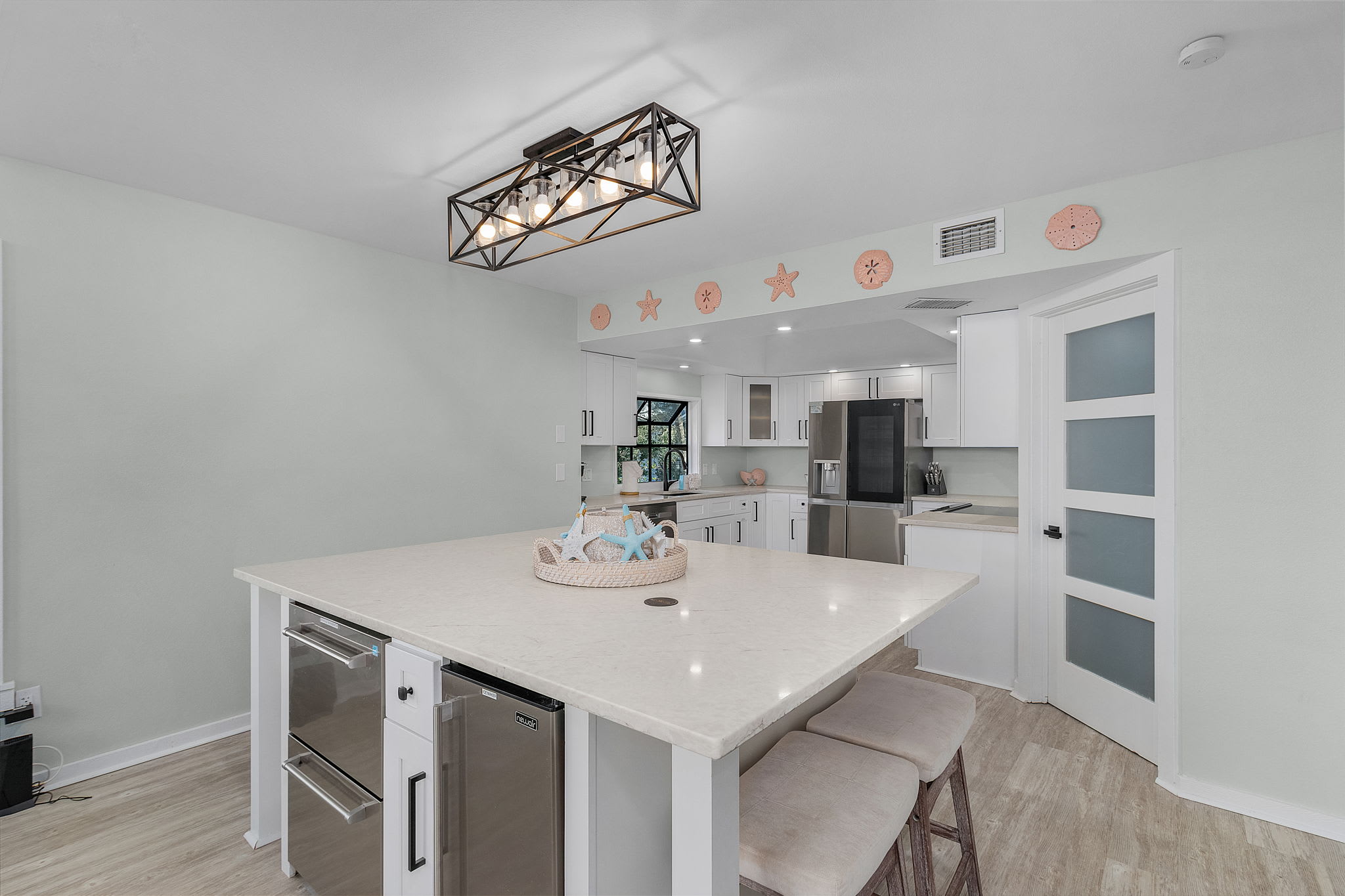 The main floor features a beautiful full kitchen with a large island and seating for eight at the bar. This fully stocked kitchen includes a full-sized refrigerator, oven, dishwasher, beverage fridge, and ice maker. A spacious walk-in pantry holds all the essentials for cooking and dining, including utensils, a large and small crockpot, a Keurig dual coffee maker, griddle, toaster, and blender—everything you need to prepare and enjoy meals together.