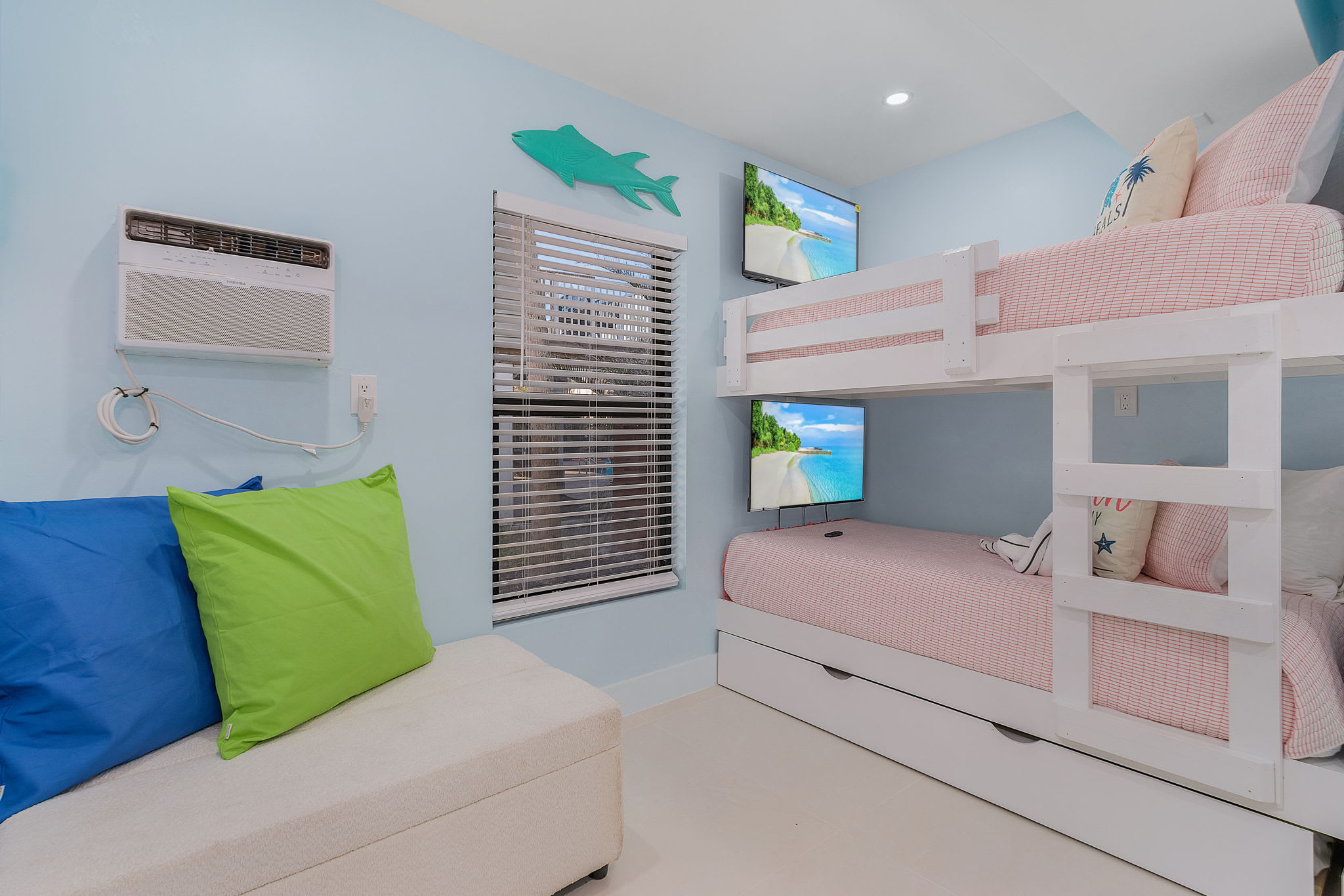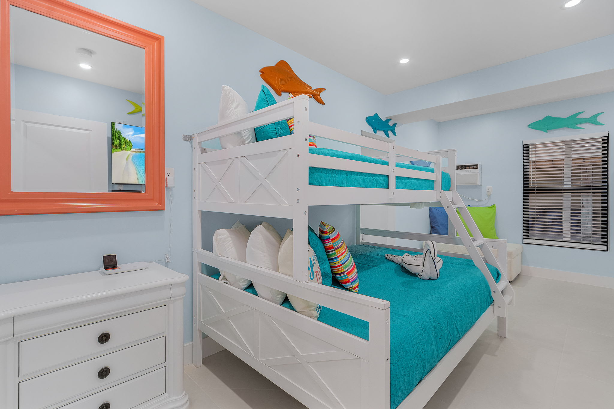 Lower Bedroom 4 has 1 queen bed with Smart TV, lower bedroom 5 is the bunk-room. There is a twin bunk bed with a Smart TV on each level. There is also a twin over full bed bunkbed and 1 more Smart TV perfectly positioned for both of those bed sleepers to enjoy.