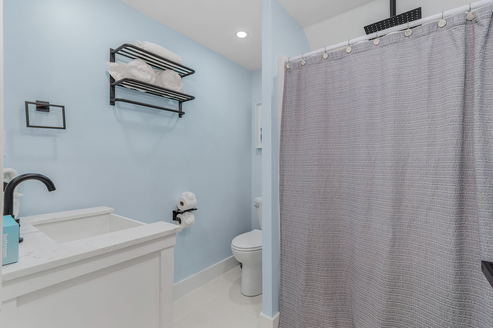 There is one full bathroom with a tub and shower combo on the main level. This is also where you will find the washer/dryer. The upper level has well thought out full bath -plus. The enclosed part of the bathroom has a separate shower with glass enclosure, vanity and commode. Just outside in a small hallway is another vanity and sink. Perfect for multiple guests to use the facilities comfortably at the same time.