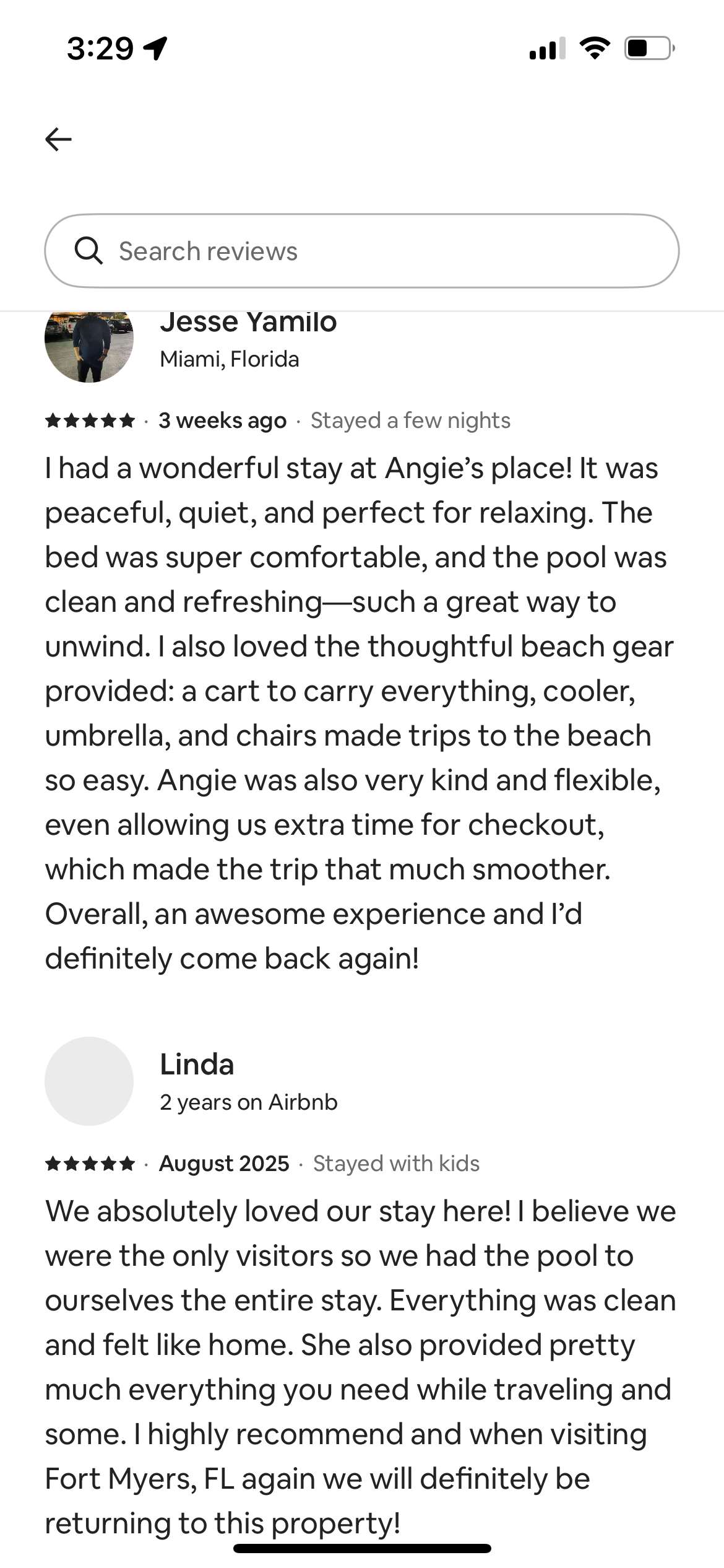 We absolutely loved our stay here! I believe we were the only visitors so we had the pool to ourselves the entire stay. Everything was clean and felt like home. She also provided pretty much everything you need while traveling and some. I highly recommend and when visiting Fort Myers, FL again we will definitely be returning to this property!- Anonymous , Posted: 8/26/2025